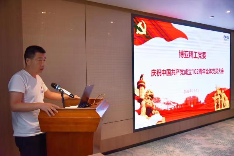 當(dāng)天晚上,在住宿酒店會(huì)議室組織召開了“慶祝建黨102周年全體黨員大會(huì)”。會(huì)議舉行了老黨員重溫入黨誓詞和預(yù)備黨員入黨宣誓儀式,黨委書記李總給預(yù)備黨員發(fā)放了《黨章》和《政治生日賀卡》。在會(huì)上表彰了公司2022—2023年度優(yōu)秀共產(chǎn)黨員,杜紅波、周微、馮攀、李波、劉軍5名同志獲此殊榮。隨后優(yōu)秀黨員代表劉軍作了表態(tài)發(fā)言,公司黨委委員輪流圍繞各自分管黨務(wù)工作談了認(rèn)識(shí)和體會(huì)。最后,黨委書記李總以《不忘“兩個(gè)務(wù)必”、牢記“三個(gè)務(wù)必”,奮力譜寫博亞“二次創(chuàng)業(yè)”新的絢麗華章,爭(zhēng)做市場(chǎng)經(jīng)濟(jì)條件下的道德模范》為題向大家講授了專題黨課。